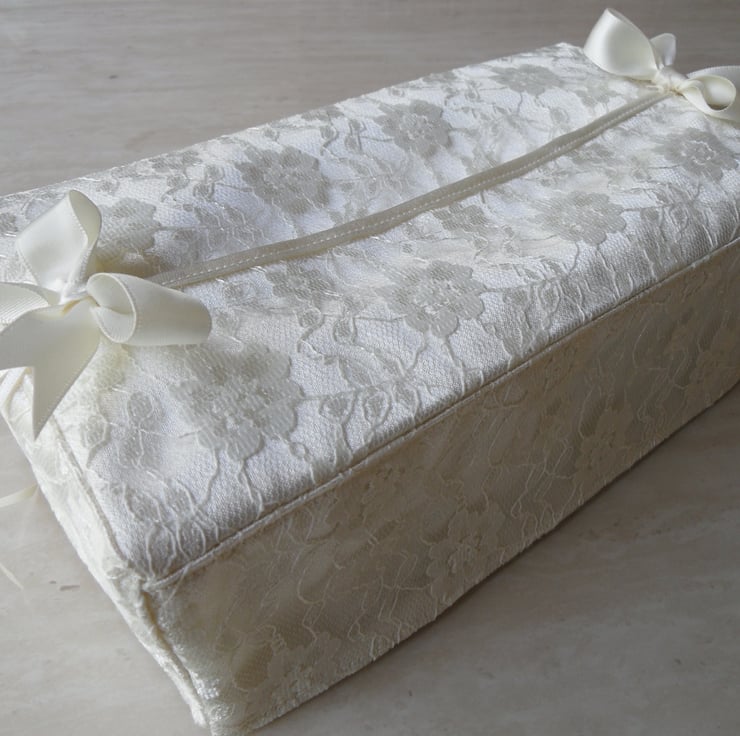 This tissue box cover is made from 3 types of fabric (lace, satin crepe and cotton). The cover is made with precision and care to achieve the exact fitting. Whole cover is lined with lining and all edges are neaten. This cover is made to fit a standard rectangular tissue box. The size is H2.75" W9.25" D5"