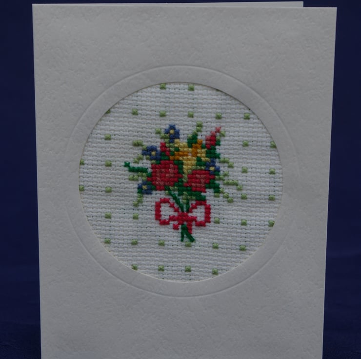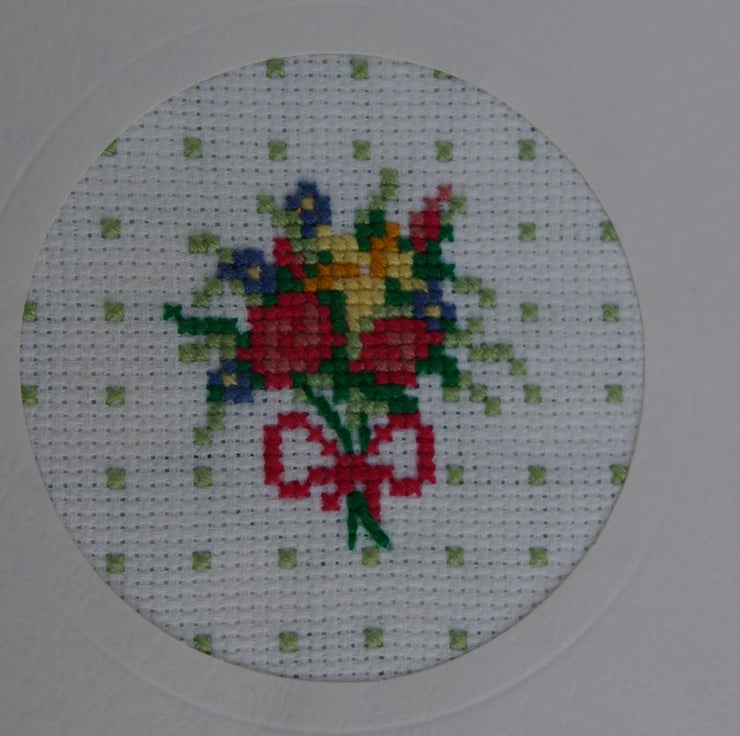 A small cross stitch floral greetings card. A cross stitched card of a bunch of flowers stitched onto white cotton aida cross stitch fabric. The background of the design is a geometric grid of light green single cross stitches. The central point of the design is a bunch of two deep red flowers with a central yellow flower. There is a red, cross stitched bow depicted around the stems of the bunch of cross stitched flowers.