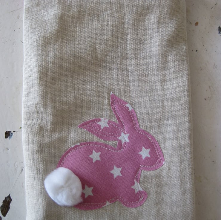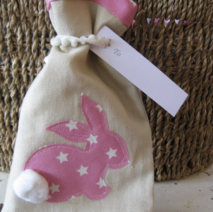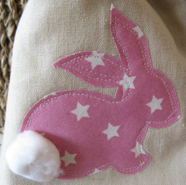 The bag has been handmade using oatmeal coloured linen and lined with white cotton. The trim is in pink and white star linen which matches the bunny image. The bunny has been bonded to the linen and sewn using free motion embroidery. A cute white, fluffy pom pom has been sewn on for the rabbits tail.