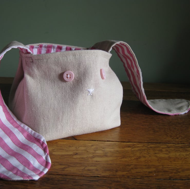 Handmade using oatmeal coloured linen and pink and white striped cotton to line. It has floppy ears which can be tied together or just left as they are. Pink button detail for eyes and a sewn nose!