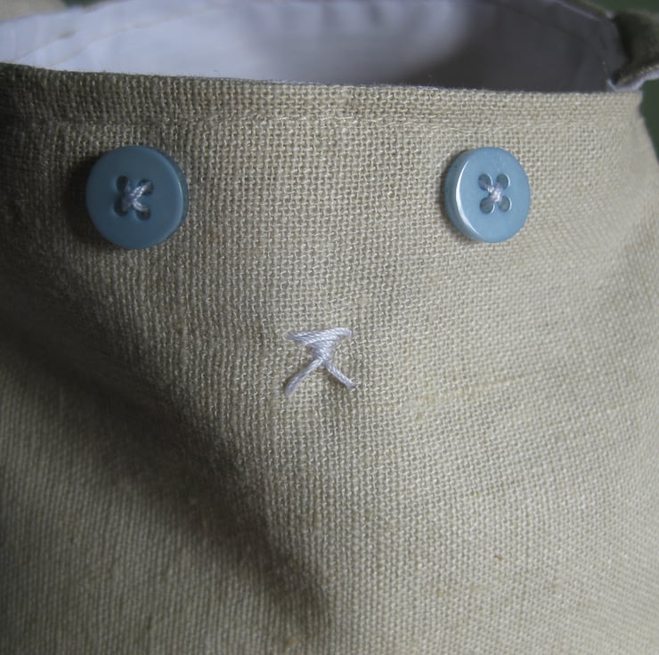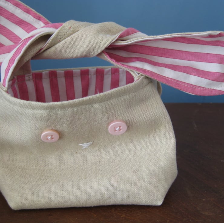 Handmade using oatmeal coloured linen and white cotton to line. It has floppy ears which can be tied together or just left as they are. Blue button detail for eyes and a sewn nose!