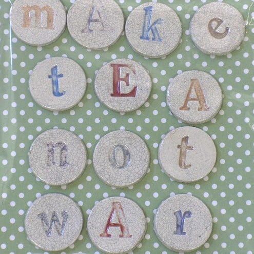 Individually handmade ceramic fridge magnets, reading 'Make Tea Not War'. Each letter is stamp with my vintage stamps, and coloured using lovely coloured under glaze, then finished in my trade mark crackle glaze. The magnets come packaged with lovely shabby chic style backing and my 'Bread and Butter' trademark.