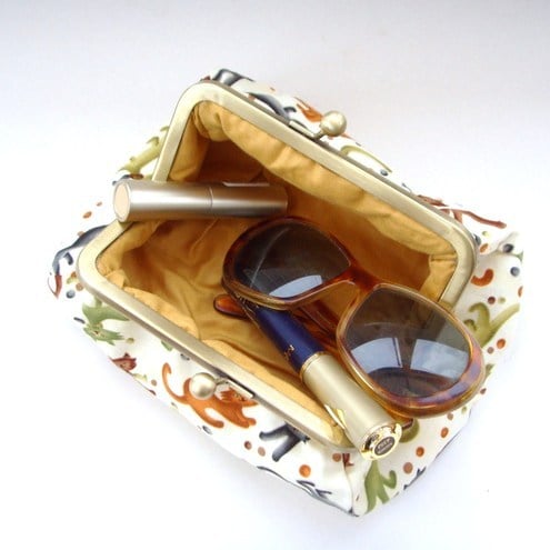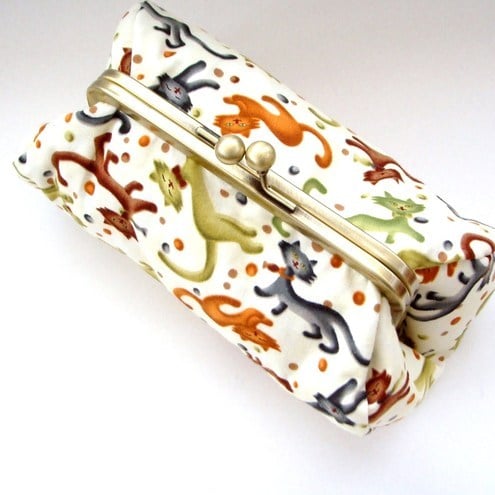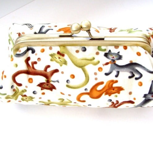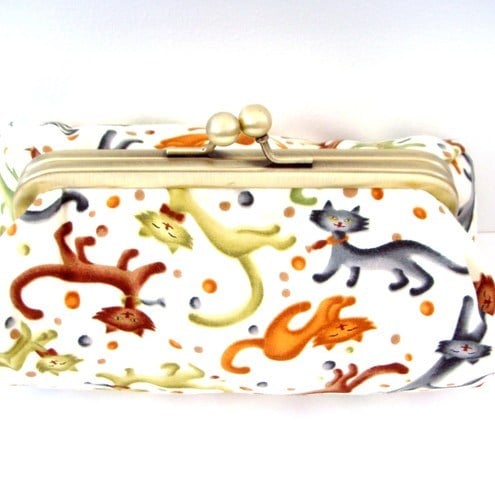 Perfect little clutch for your mobile phone, keys, sunglasses,change and credit cards or even a make-up bag. Pretty colourful cats fabric with contrasting lining, padding and metal frame clasp.
