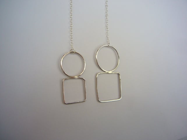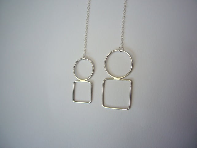 This is a simple design, all made with sterling silver. Two wire circle & squares have been soldered to each other and then attached to either end of a 53cm chain. Once around the neck, one of the circle/squares goes through the other square to create a necklace. (Note, due to the lightness of the circle/square, I like to put it through the square twice to give some security to the necklace.) The slightly larger circle/square is approximately 4.2cm high & 2cm wide; the smaller one is just under 2cm wide & 4cm high.