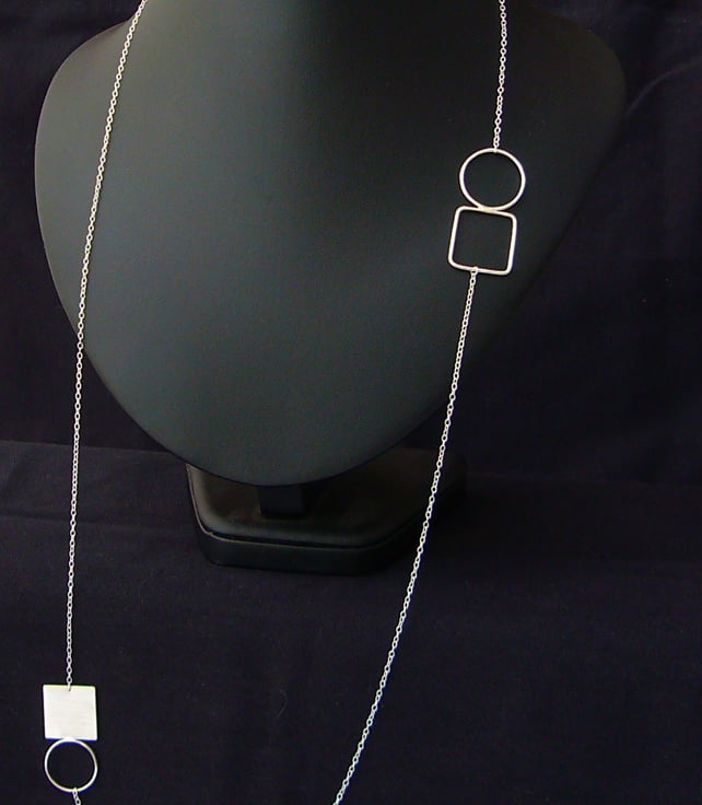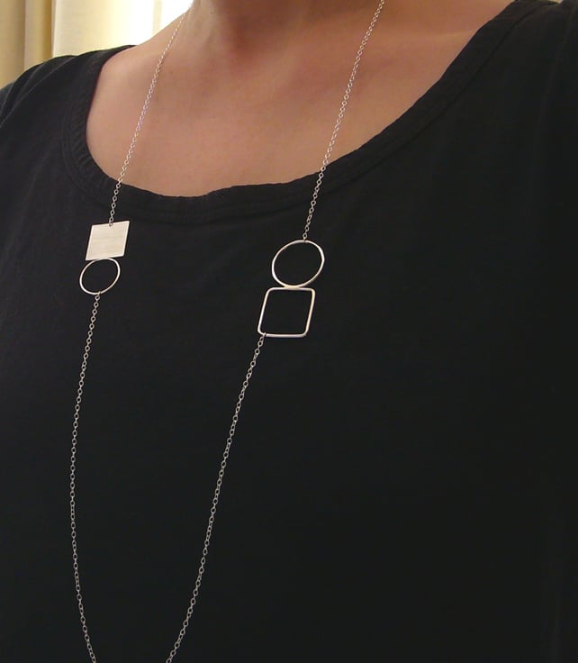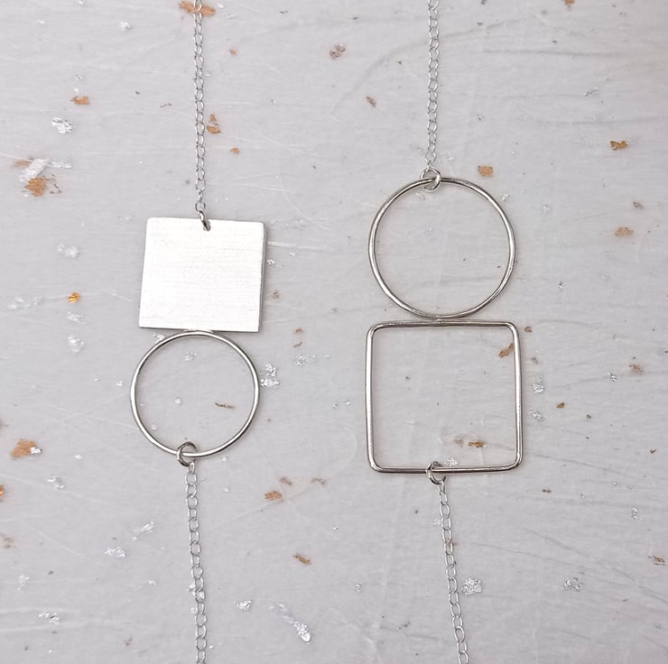 This sterling silver wire and sheet necklace has been created by shaping recycled sterling silver wire into circles and a square and soldering the different shapes together. The pieces have then been attached to sterling silver chain. It is part of a collection of necklaces made by combining circles and squares.