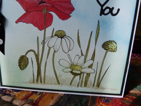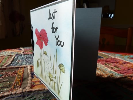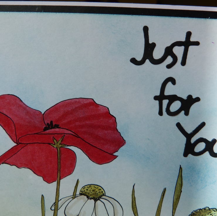A completely handmade,unique design of a poppy and daisies drawn in pen and ink and water coloured onto white card. The background coloured in pale blue graduating towards the bottom of the card into pale green. Mounted onto black paper and then onto quality white card. Finished off with die cut Just for You and a black/white spotted ribbon bow.