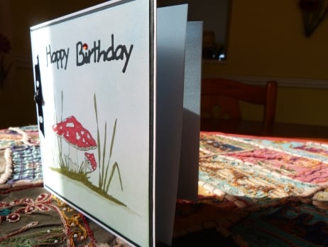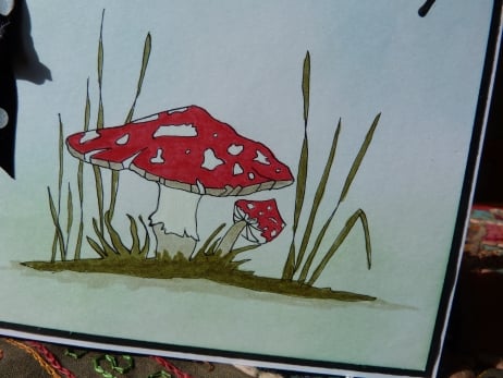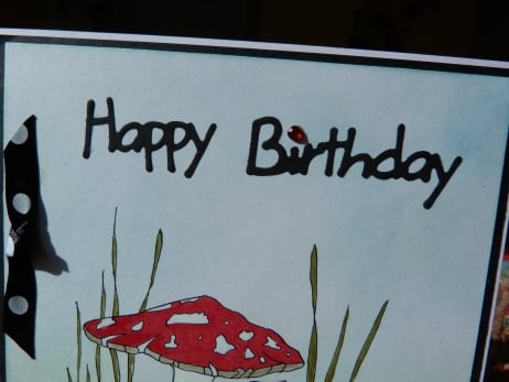 A completely handmade and unique designed card. A red mushroom with grassed drawn in pen and ink and water colour pained onto white card. The background is coloured in pale blue graduating down the card into pale green. Mounted onto black paper and then onto quality white card. Finished off with die cut Happy Birthday and red rhinestone and a black/white spot ribbon bow.