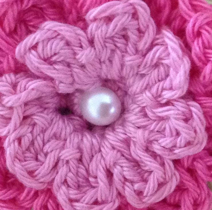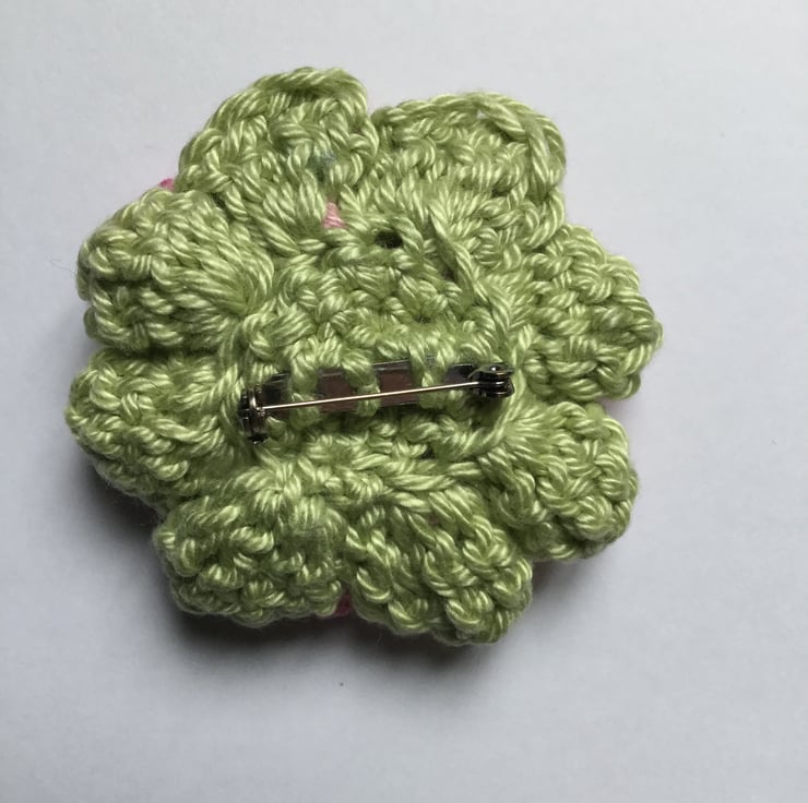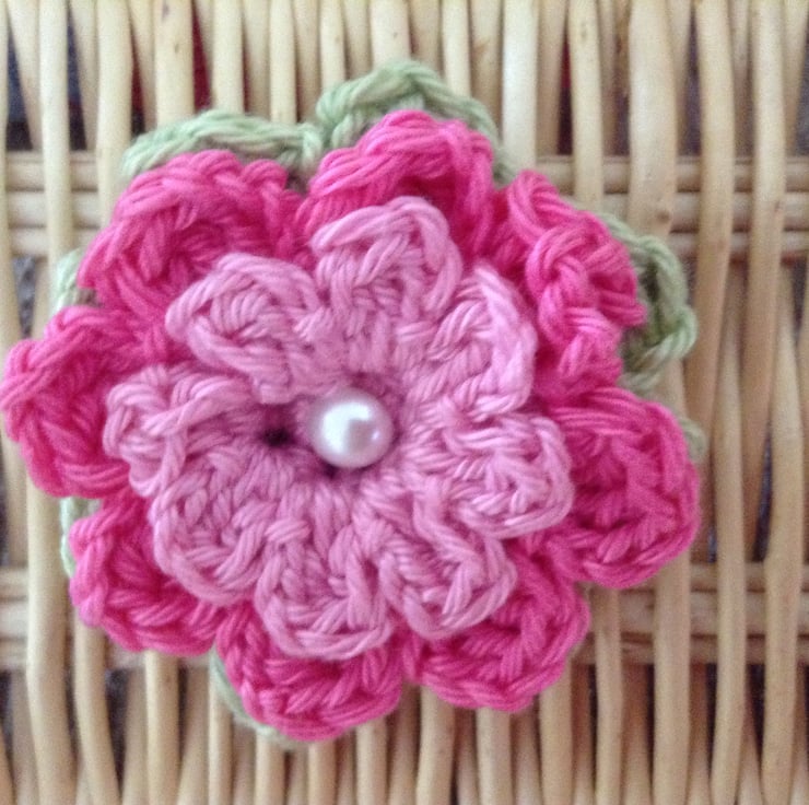 Hand crochet flower brooch in summery shades of pink.