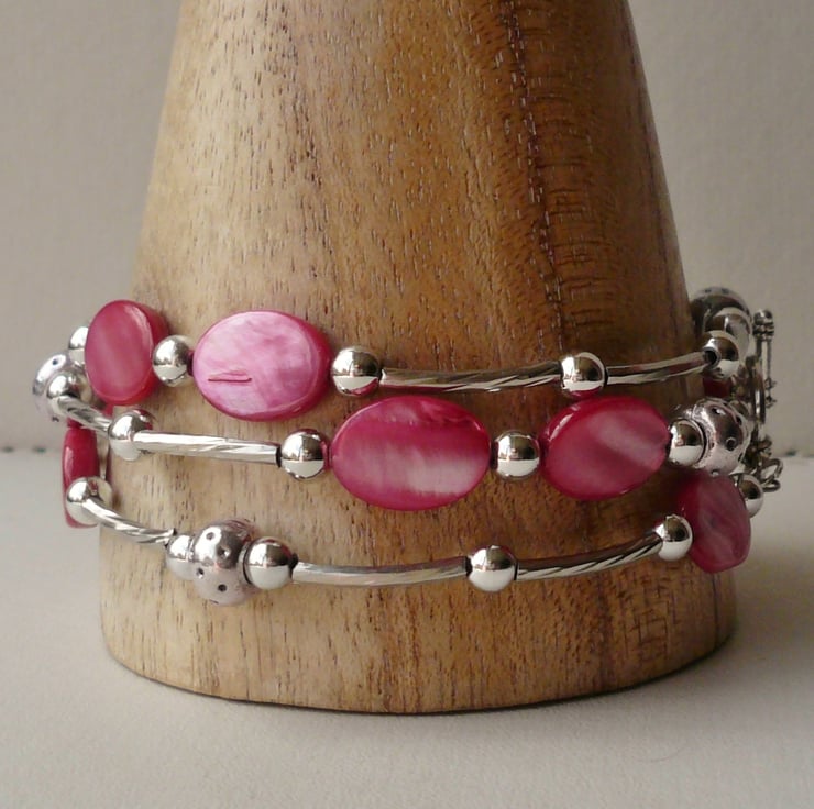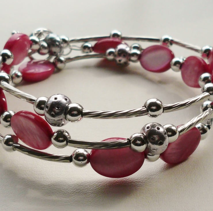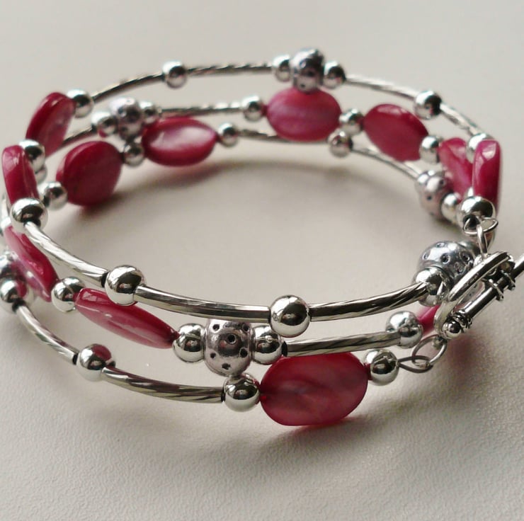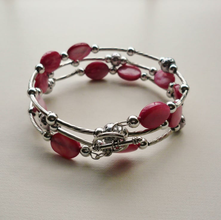 This bracelet is made up of 14mm flat oval shaped shell beads in a lovely cranberry pink, mixed with silver plated round and tube spacers and Tibetan silver spotted rondelle beads. These have all been threaded onto three coils of silver plated memory wire and finished off with a toggle clasp.