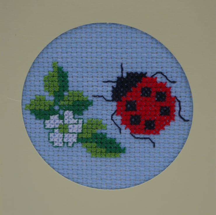 A pretty Ladybird, Cross Stitch Card. The main design for this greetings card is a large cross stitch ladybird stitched onto a background of blue colour cotton crossing stitch aida fabric. Also with this design is a stylized white flower with green foliage.