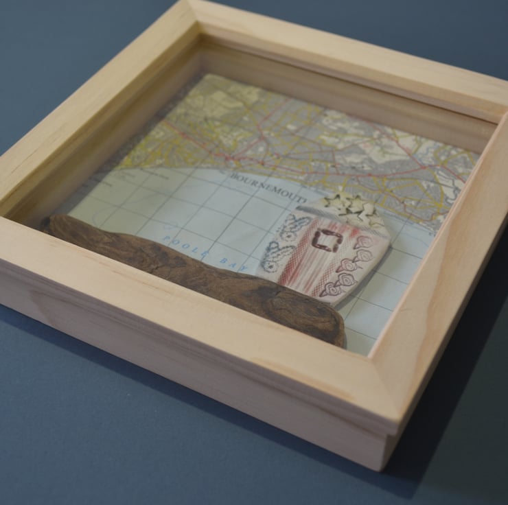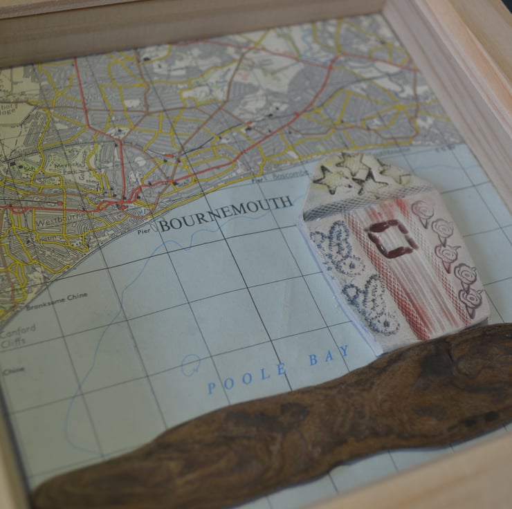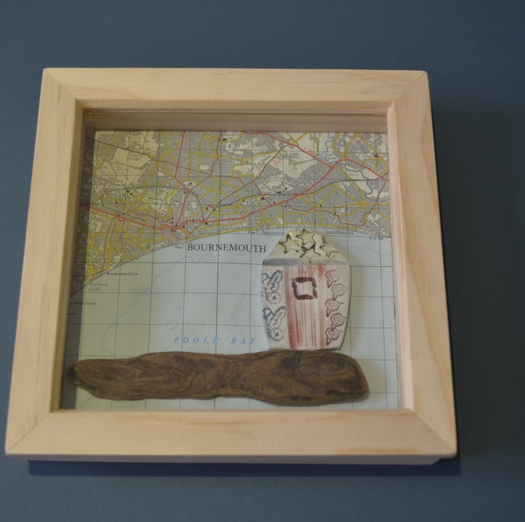 I have made these little houses from white earthenware clay that is stamped with various objects and fired with underglazes. It has a matt finish with small amounts of shine from the glaze. It is mounted into a natural wood box frame that measures 19cm square. It includes a lovely piece of a 1960's map of Bournemouth.