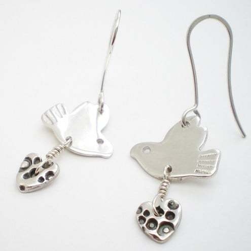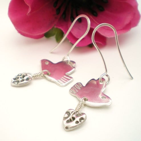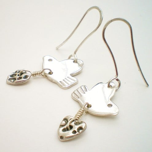 The fine silver doves measure 1.8cm x 1.5cm and are hung with tiny textured and patina treated silver hearts. They are hung on sterling silver handmade earring wires making the total drop 4.5cm.