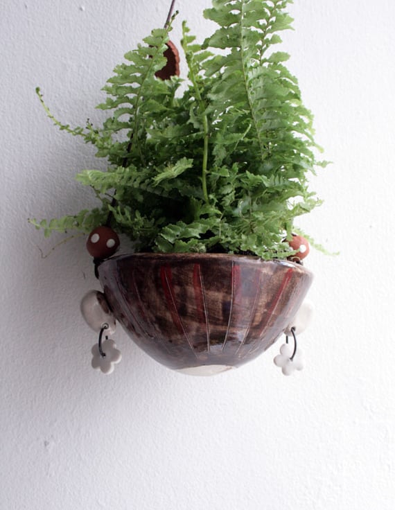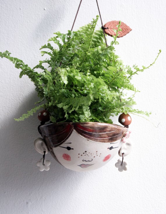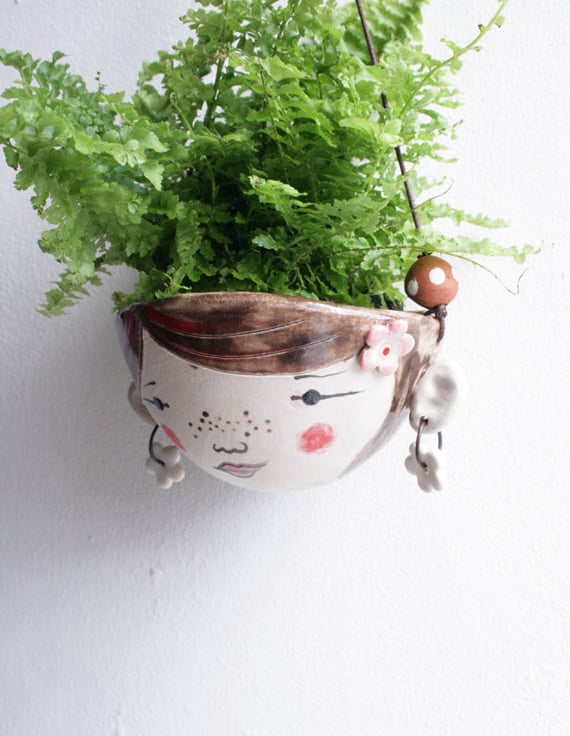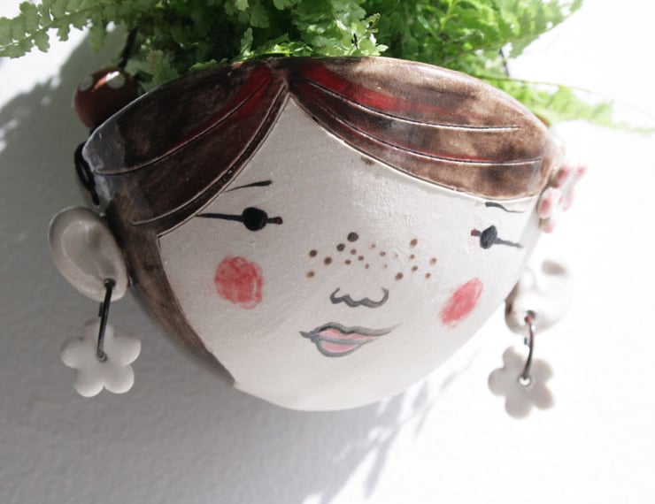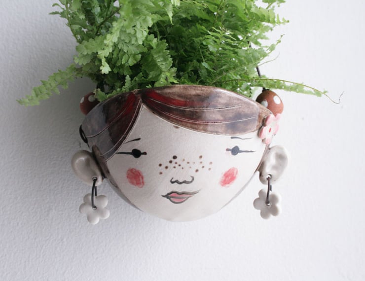 A hand formed stoneware planter with hand painted character.
