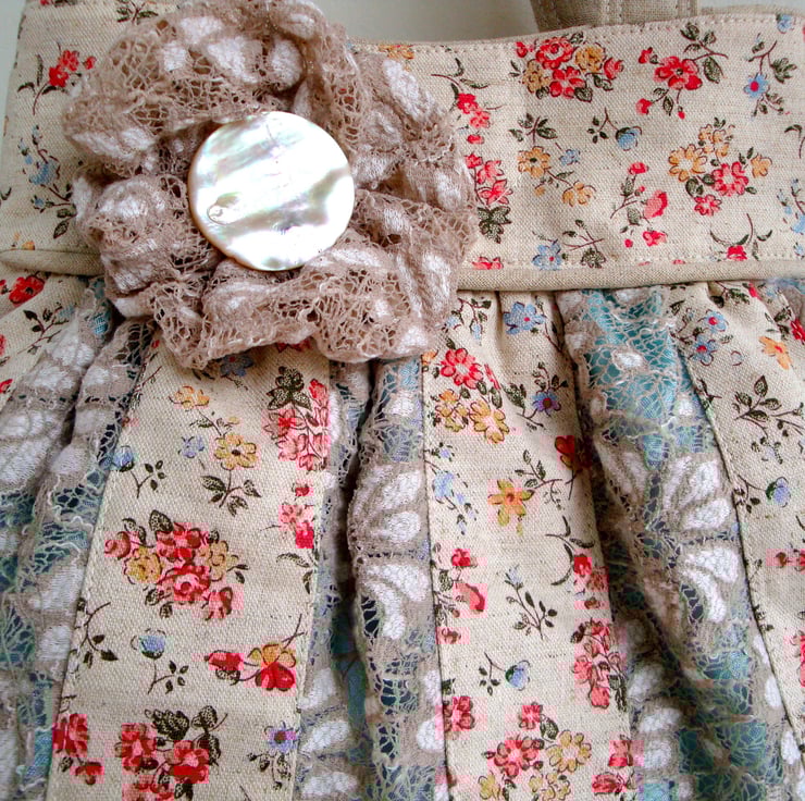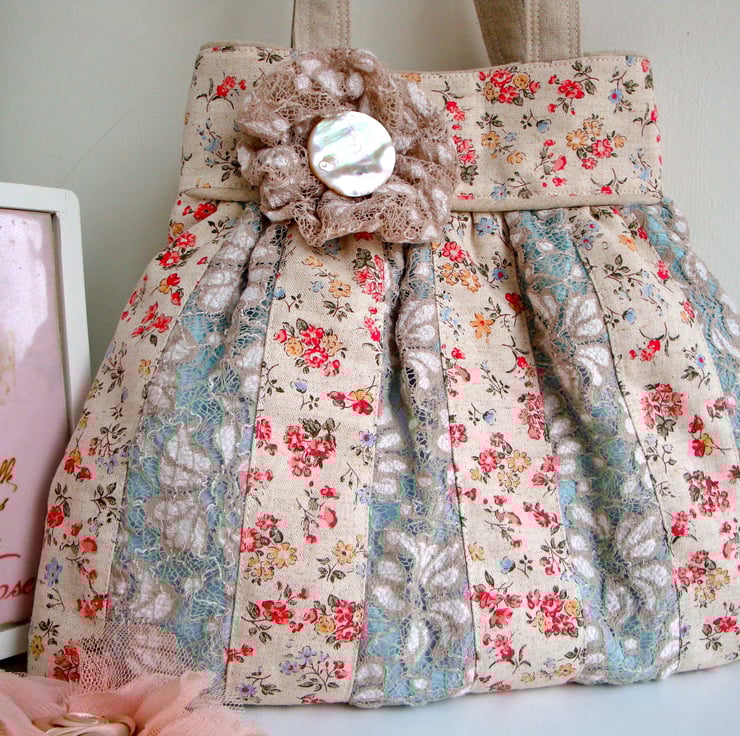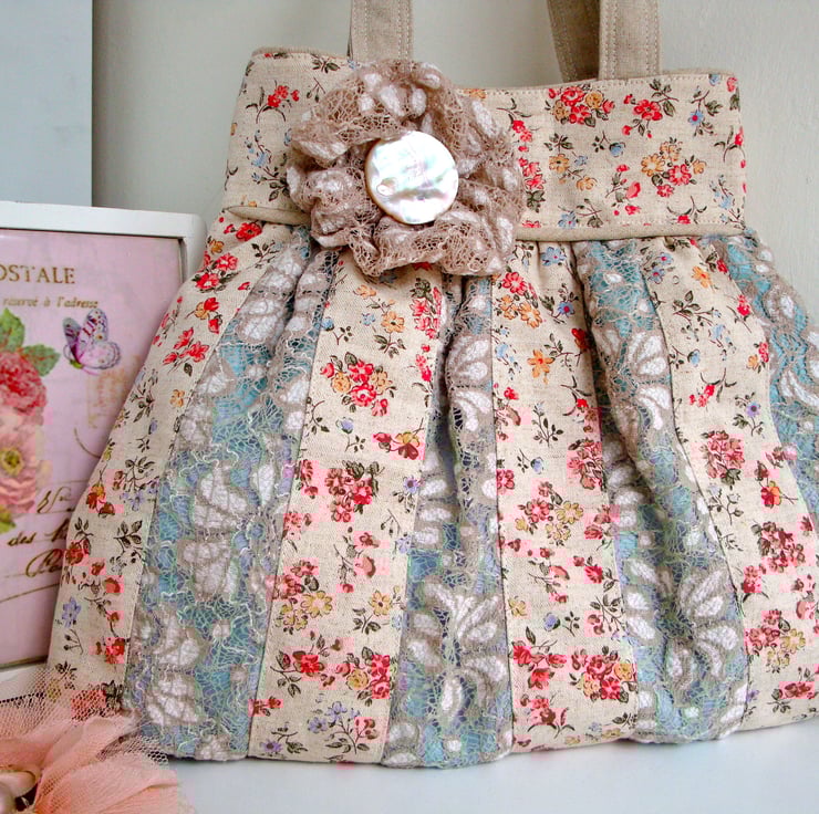 Handmade to my own design , I used beige/cream lace and a printed floral cotton linen .