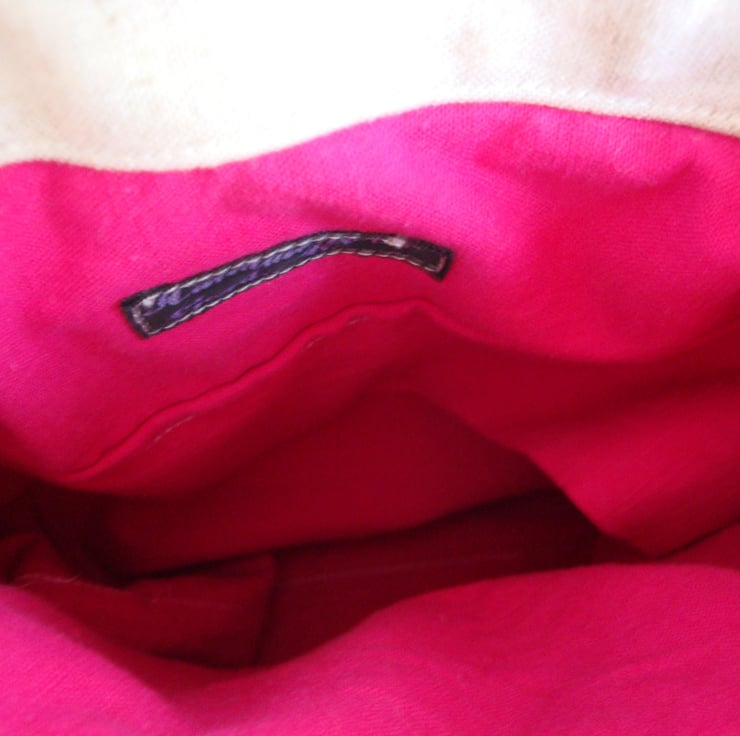 Fully lined ( backed to backing fabric ) in a raspberry pink cotton fabric . With a handy internal slip pocket and a pocket flap.