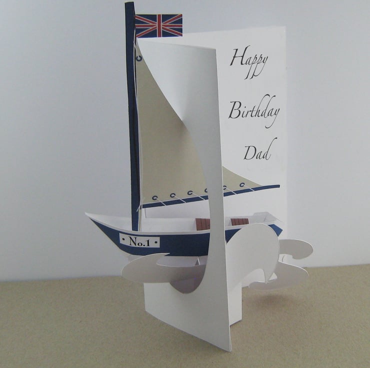 An original and unique personalised handmade card. When opened a sailing boat takes form popping out of the front of the card.