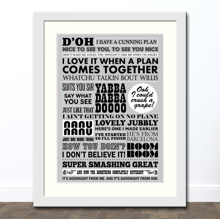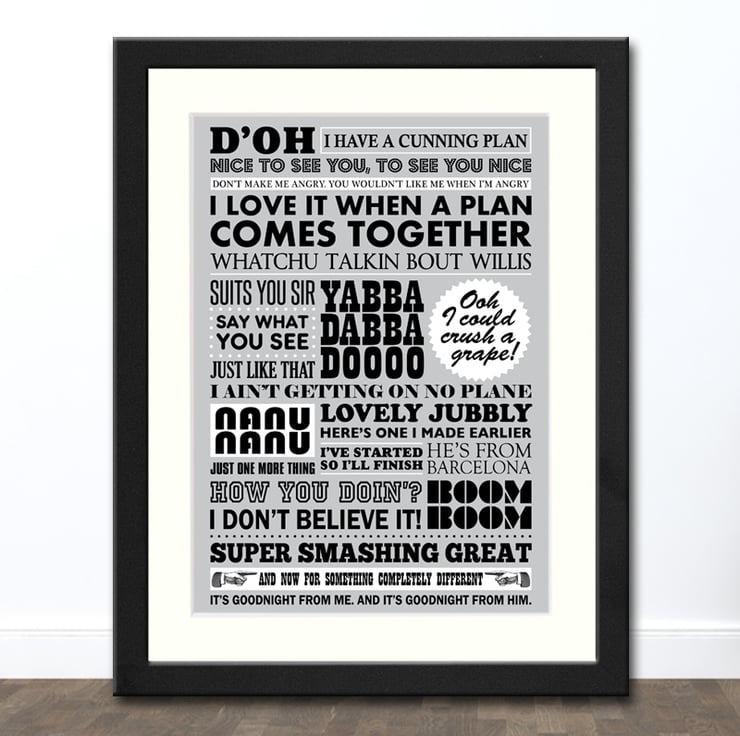Take a trip down memory lane with this typographic collection of catchphrases. Containing many well-known quotes from classic TV programmes of the 70s, 80s and 90s, it's impossible to read them without doing impressions of the voices - go on try it! Designed in a colour scheme reminiscent of black and white TV (yes, that really was a real thing).