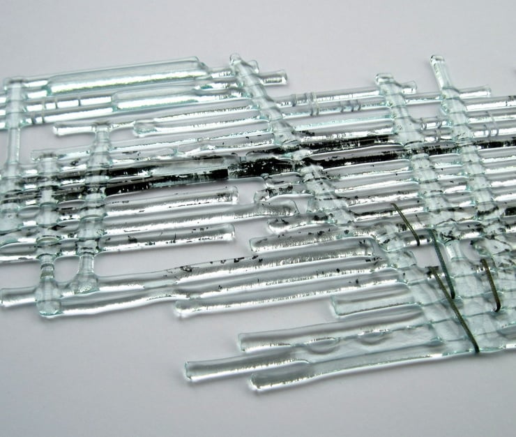 I try to use recycled glass wherever possible; the glass used for these pieces is old picture frame glass reclaimed from a house clearance. It is 'float' glass, so although the glass is clear it will show a faint greenish colour, especially along the edges, which is perfect for the shoreline scene.