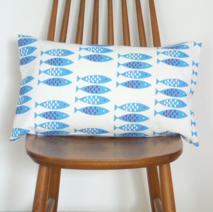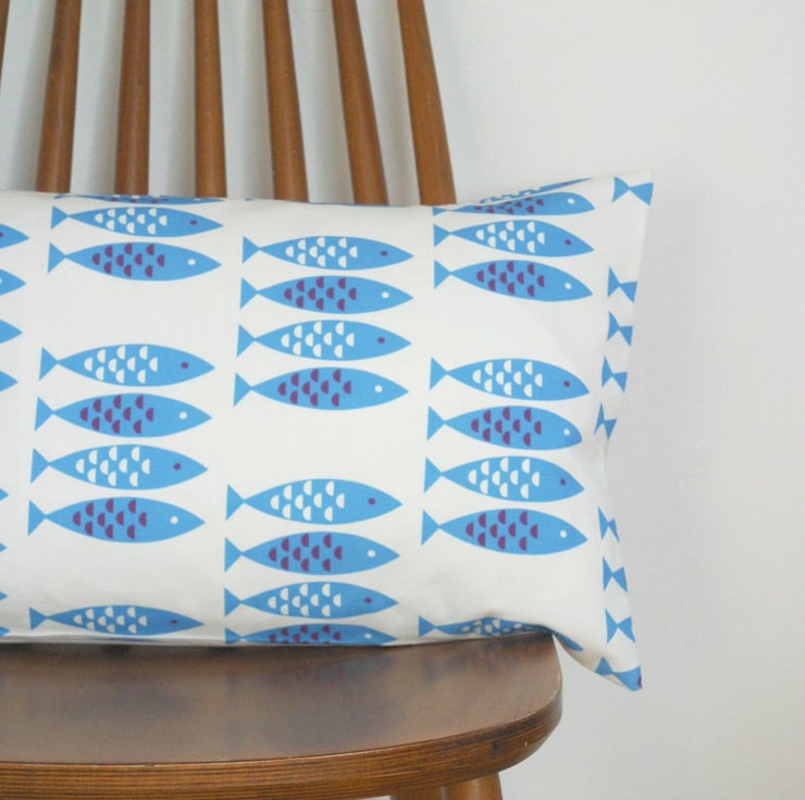 A handmade bolster cushion cover in my Newlyn Fish print.