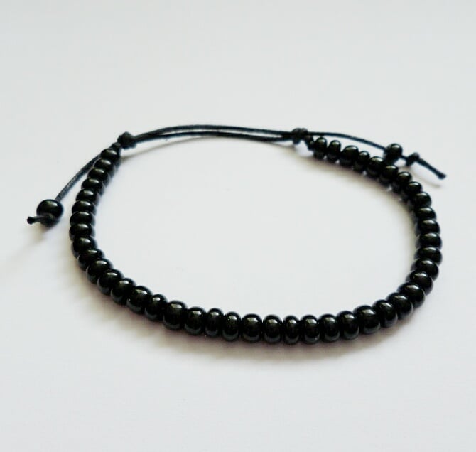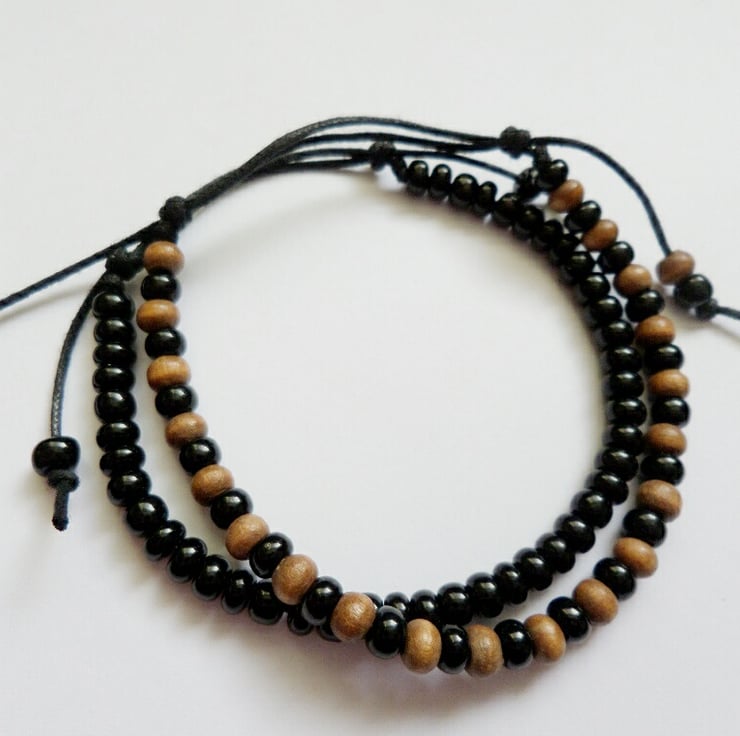 These 2 bracelets come as a set. The first bracelet is made from 5mm black glass beads and the second is made from 5mm black glass and 5mm wood beads. Both bracelets are made with black cord with a sliding knot to adjust to different wrist sizes.