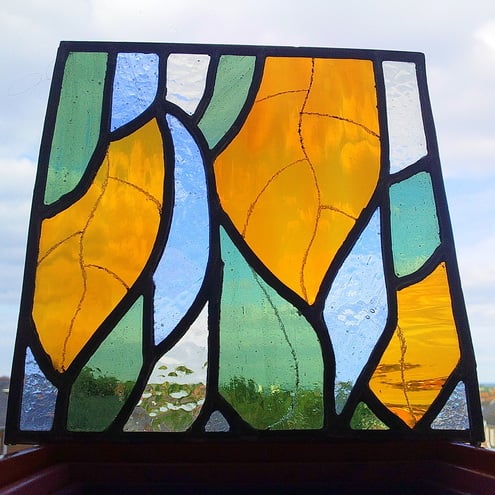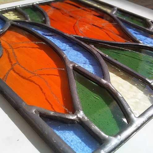 This striking panel will look beautiful leaning or hanging in a window. I have hand etched detail on the leaves and used a range of oranges, greens, yellows and blues to pick out the colours of the pattern. The inspriation for this design was taken from an art deco fabric print I found in an old french book of samples, and is a vibrant and elegant statement for your home.