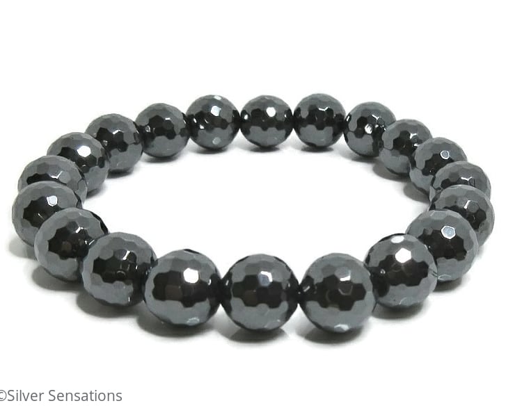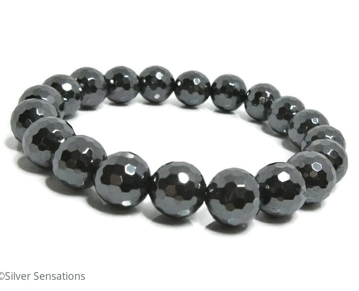 For this chunky handmade stretch bracelet I chose 10mm Hematite beads which have small, high quality, facets on them.