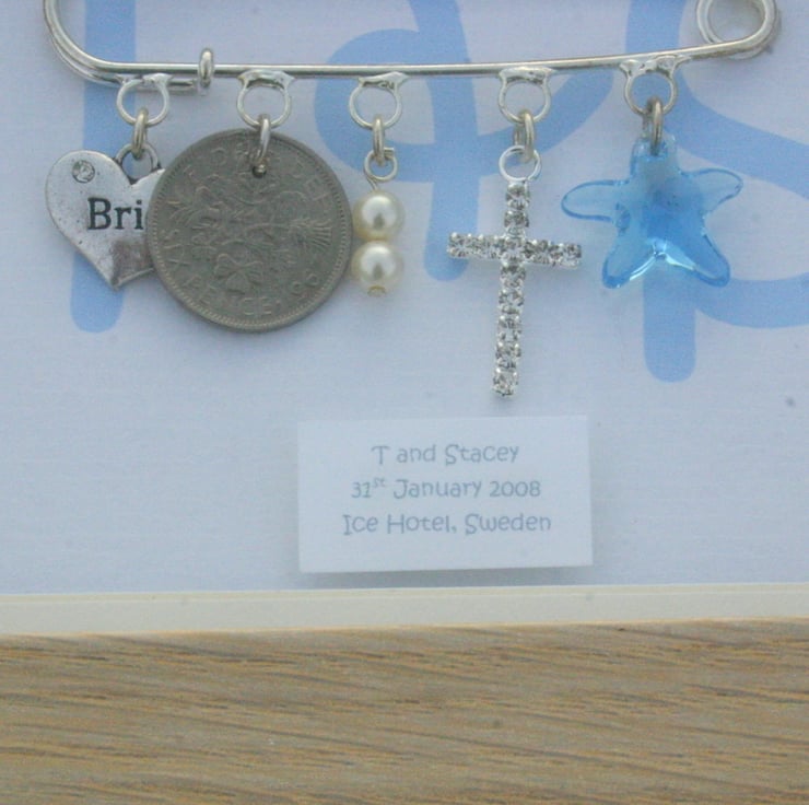 I made my first framed kilt pin for a best friends first born. So many people fell in love with the gift and asked my friend if she knew where it came from and subsequently I have made many more for births, christenings, marriages and even deaths. Anytime someone wants a memory of a special occasion. This frame celebrates my own wedding.