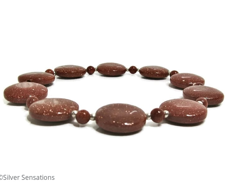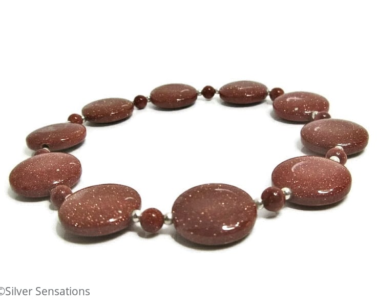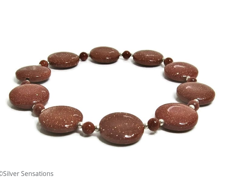 Sparkly Tan Brown Goldstone Coin Beads & Sterling Silver Stretch Bracelet