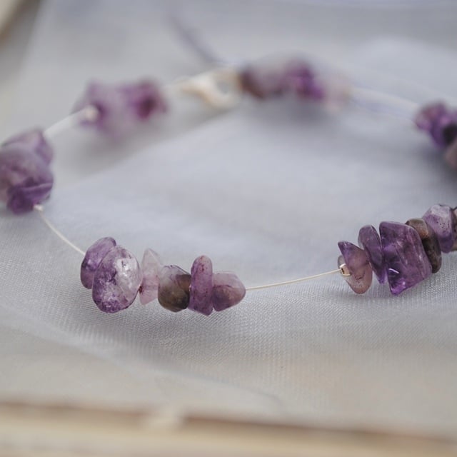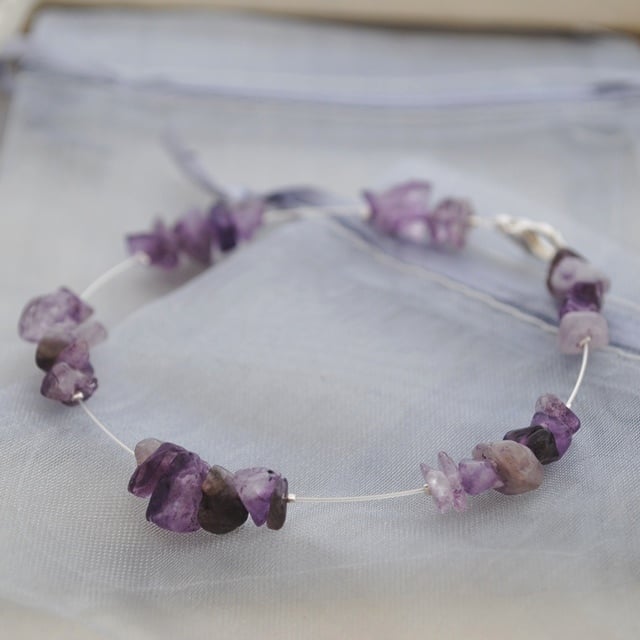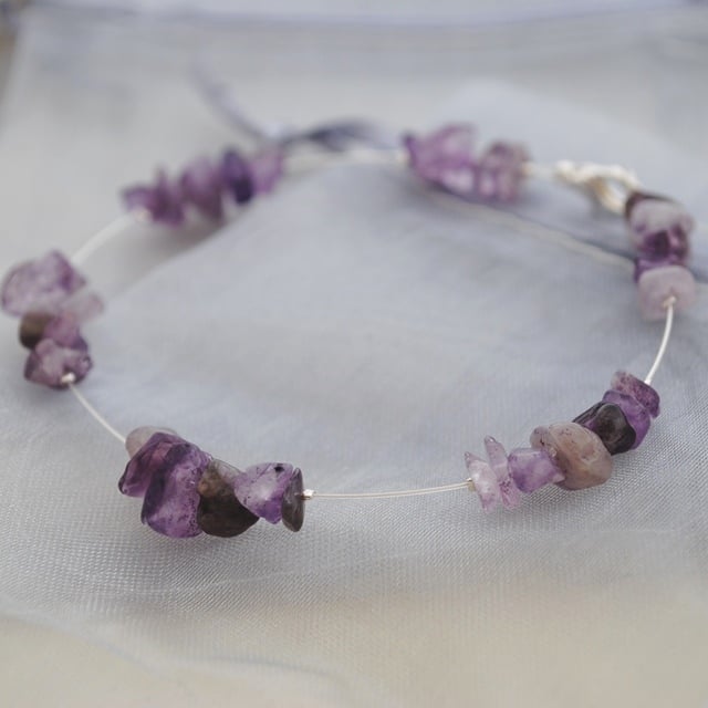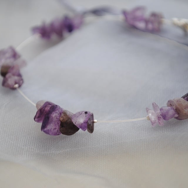 Amethyst chips arranged in clusters along a silver-plated tiger tail "chain". The amethyst chips show natural variation in tone with some cloudy and others clear.