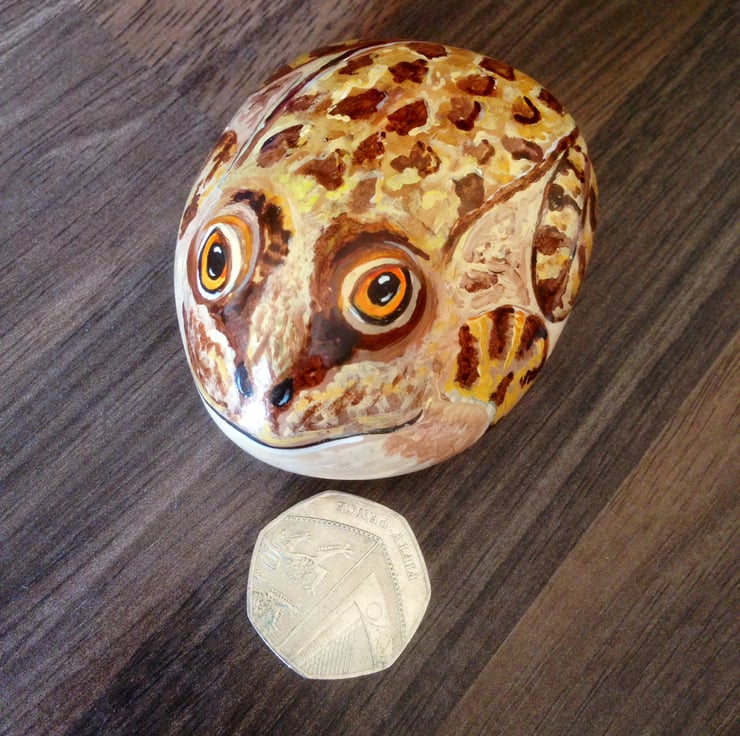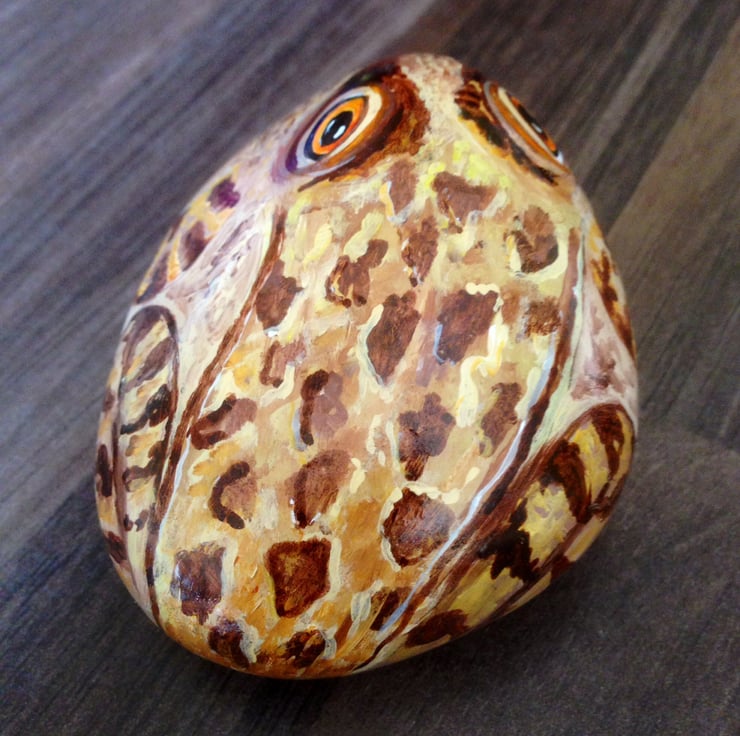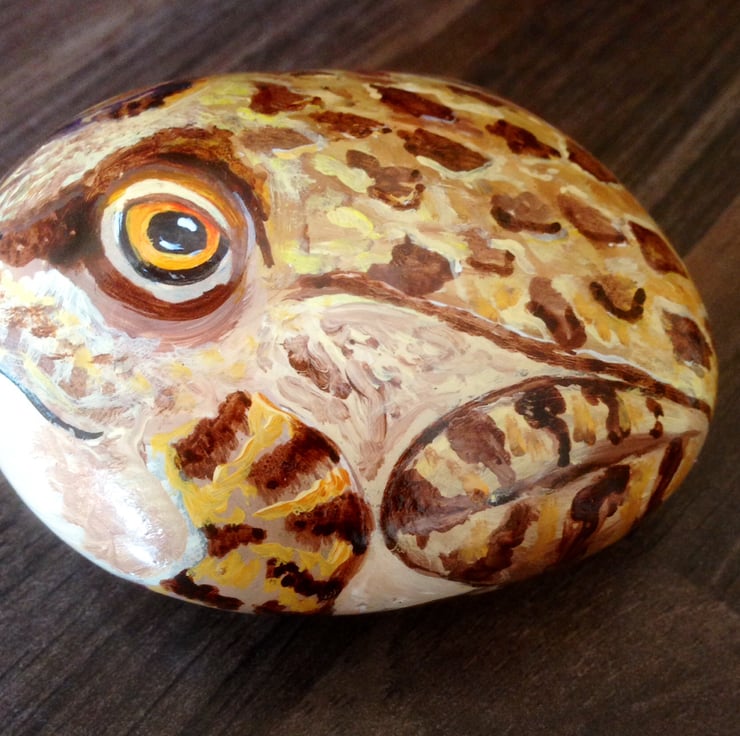 This little frog has been hand painted onto a shaped rock and glazed for a glossy protective finish. If this will be going outside I can spray with an outside glaze to protect against frost and direct sunlight so please ask when purchasing thanks