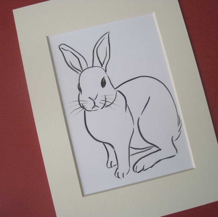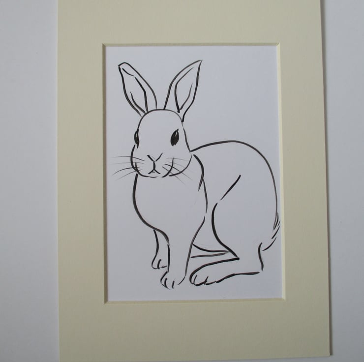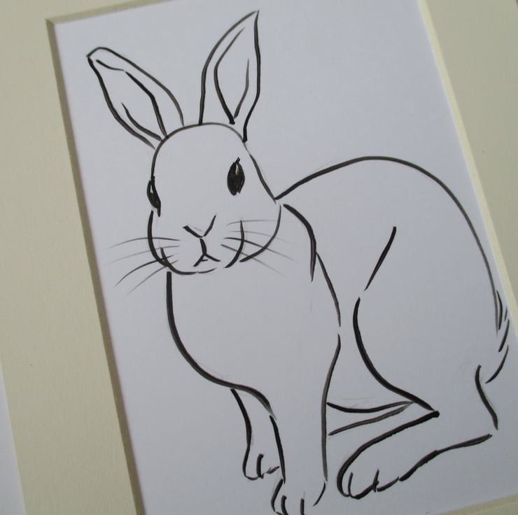 An original line painting of a bunny, painted in acrylics on white A6 card, supplied in an ivory mount ready to fit into a 7 x 5 inch frame.