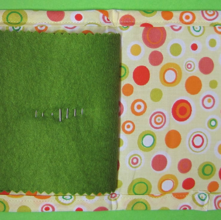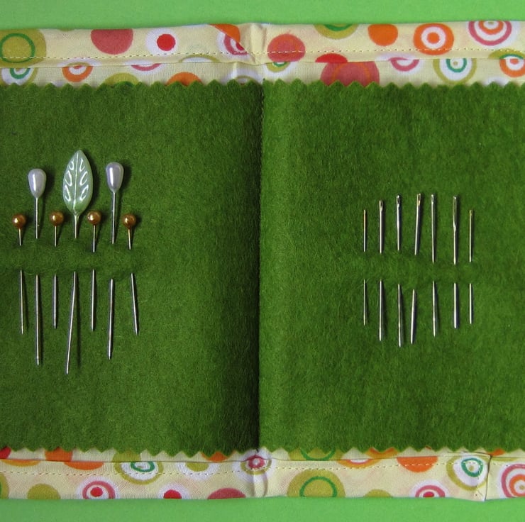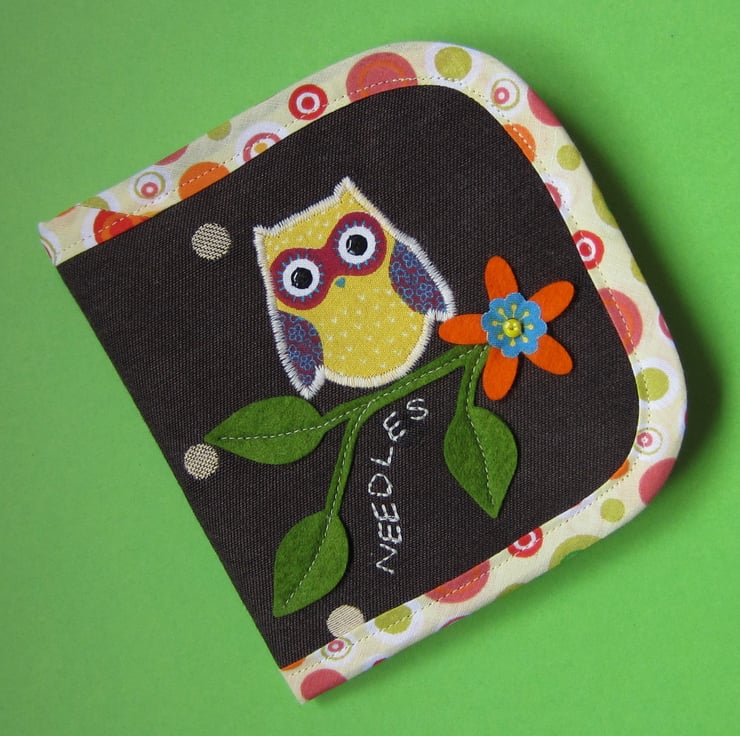 Lightly padded brown spotty needle case appliqued with an owl and decorated with felt leaves and flower. Inside there is a green felt page complete with pins and needles. Measures 13 cm x 12.5 cm when closed (13 cm x 25 cm open).