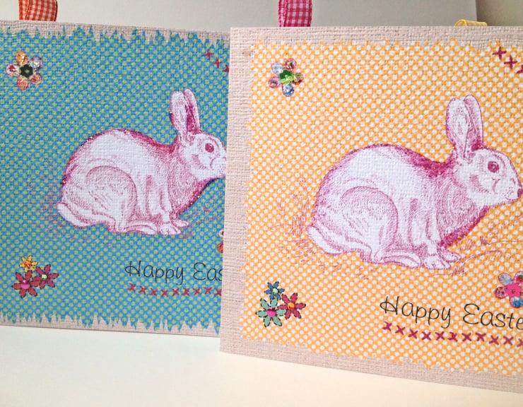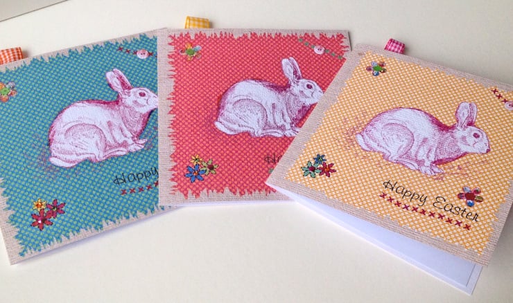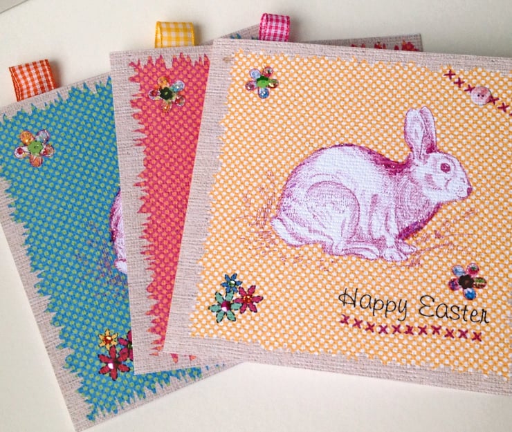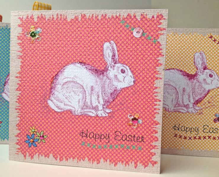 The printed background is a linen effect in a natural colour, with a printed 'fabric' effect in spots, with a few stitches and button images.The main image is a vintage bunny image.