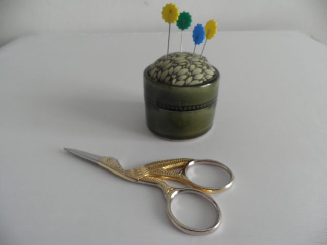Very useful and practical pincushion, the eggcup itself is dark green pottery from Sweden, with a lovely contrasting fabric for the pincushion, filled with polyester filling.