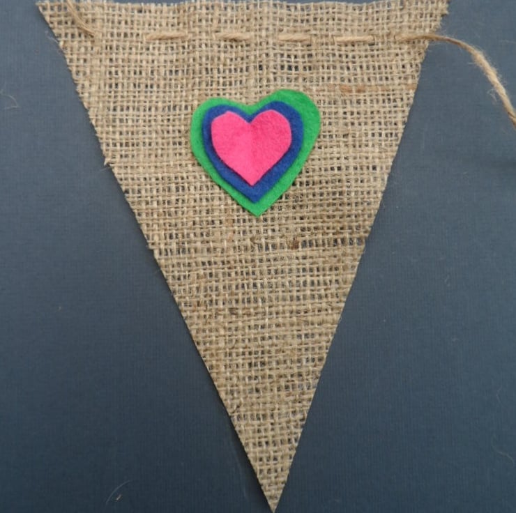 Fabulous rustic style bunting with 10 hessian (burlap) flags, measuring 15cm x 18cm each, threaded on 2m of jute twine.