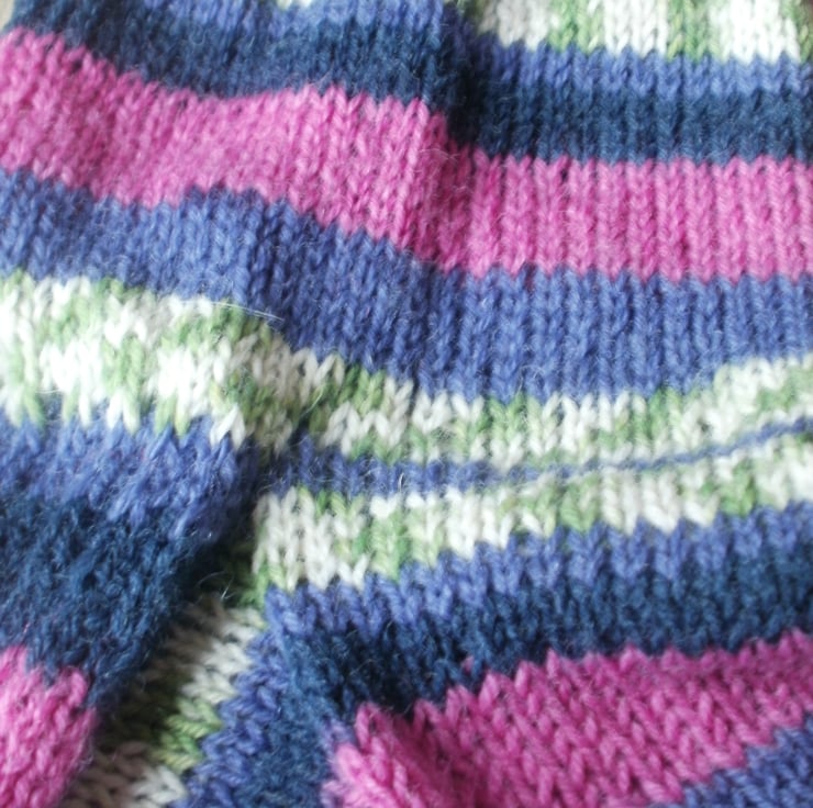 Lovely ankle length socks - knitted with a long cuff which makes them a bit slouchy. Ideal for anyone with circulation problems as there's no elastic to cut into you. Or just for lounging around in. Made on five needles, so no seams to rub either. Fits up to a size 7 foot comfortably.