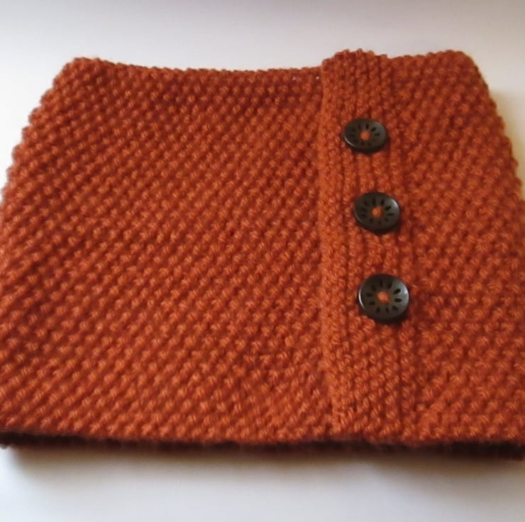 This ladies Aran wool cowl neck warmer is great for keeping that winter and Spring chill off. It's made in a lovely soft burnt orange Aran wool (25% wool) and fastens with 3 chocolate brown wooden buttons. It's hand knitted in a moss stitch pattern.