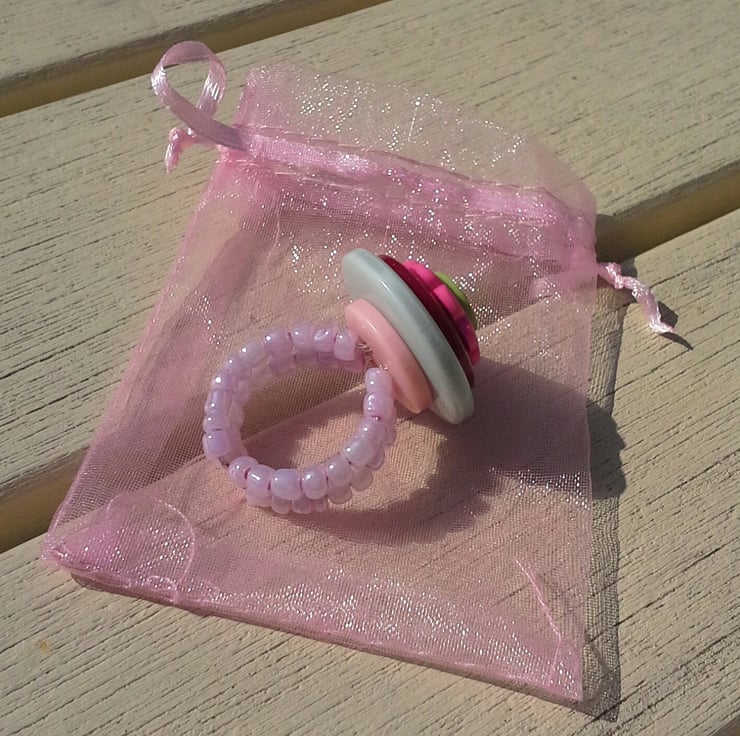 This sweet little ring has been made using four pretty coloured buttons stacked on top of one another with a pretty flower button in the center, the ring also come with a pretty organza pouch.