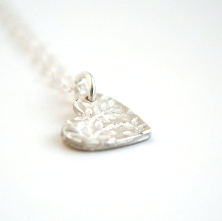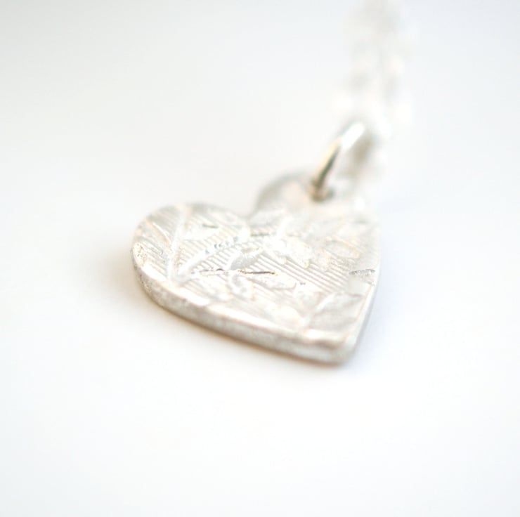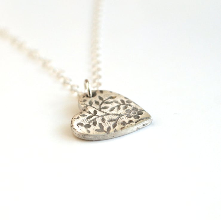 A 10mm fine silver heart with our Secret Garden pattern impressed into the silver. Hangs from a sterling silver trace chain, please state chain length preference when ordering. (16/17/18 inch).
