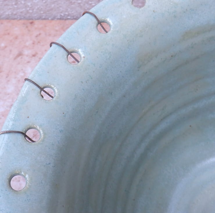 The bowl was thrown by me on my pottery wheel using strong white stoneware clay and the holes made whilst still damp.