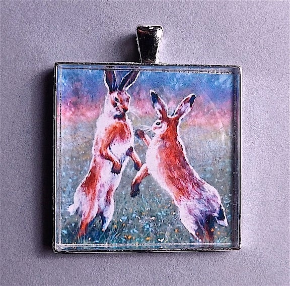 Necklace, Brown hares pendant, from and original oil painting " Boxing Hares V " cabochon frame size 45 mm X 35 mm including bail snake chain necklace length 23 inches ( 59 cm ) with lobster clasp fastening, cabochon frame, chain and fastening silver plate. Can be supplied with choice of necklace lengths or various colours of leather thongs.