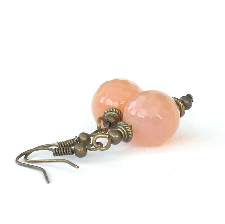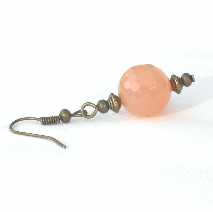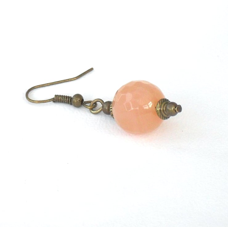 The carnelians are 12 mm faceted rounds, and are a little translucent when viewed at close range. Each of the beads on the strand varies, and I have matched this pair that are more of a peach colour than others on the strand.