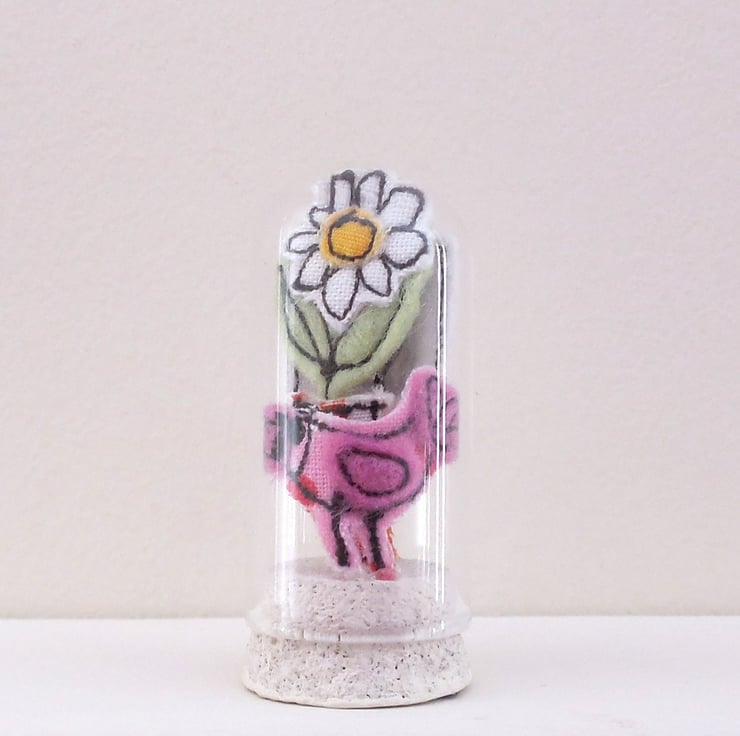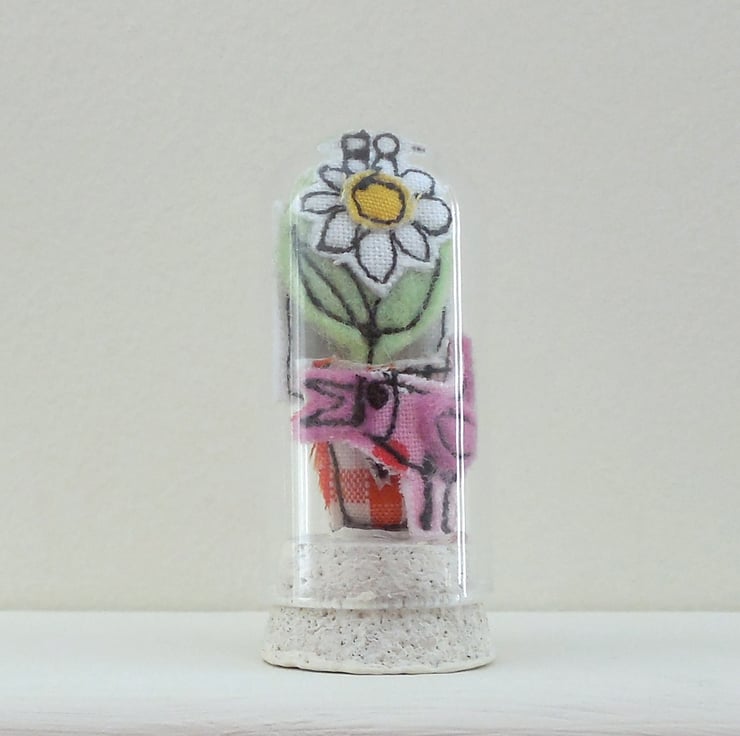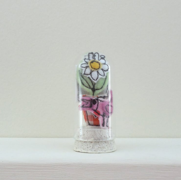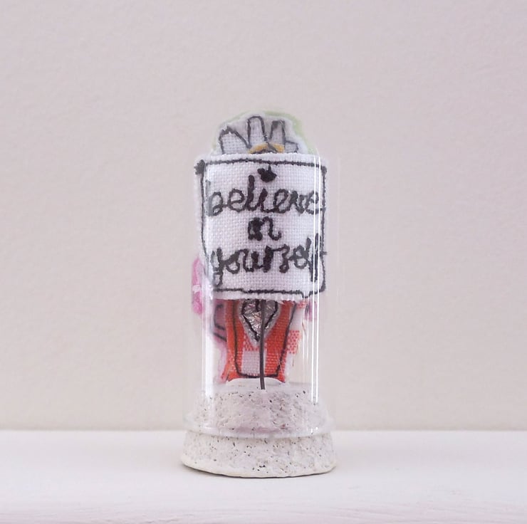 A miniature glass dome measures 4.5cm with a painted cork base. The dome encapsulates a sewn flowerpot, bird and has a sewn flag saying 'believe in yourself'. A delightful decoration designed, handmade, sewn and hand finished by me in Oxfordshire.