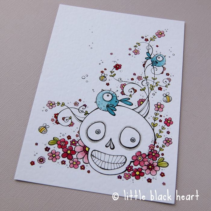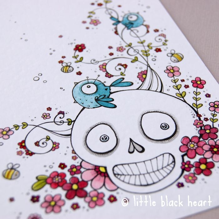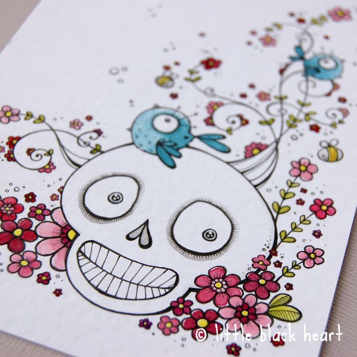 a sweetly smiling skull, surrounded by gorgeous swirly spring blossom, bees and a little chirping bluebird or two!