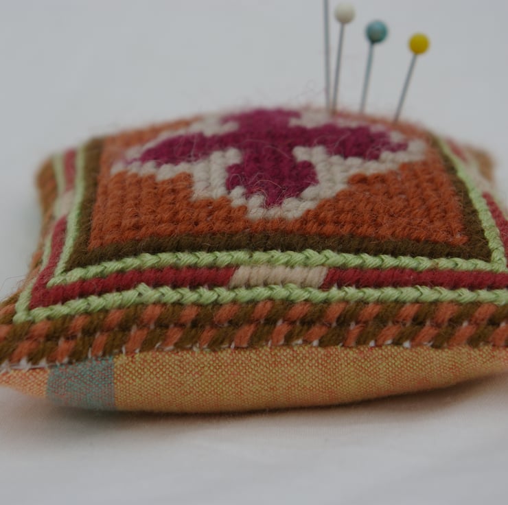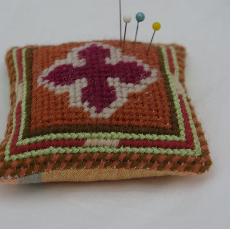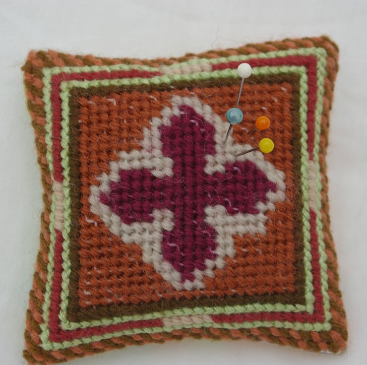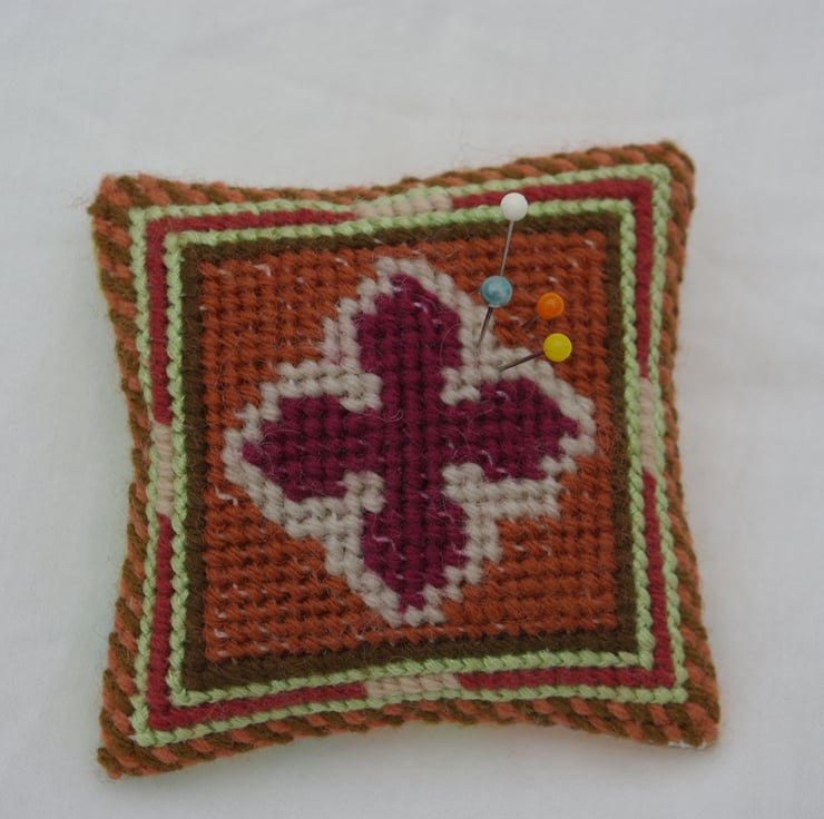 Pretty little Pin Cushion hand stitched in tapestry wools onto cotton canvas. The centre of the pin cushion is a stylized Celtic themed cross in a deep maroon with a light beige outline. The pin cushion has been hand stitched in browns, a muted red and greens. There are two rows of light green cross stitches in embroidery thread.