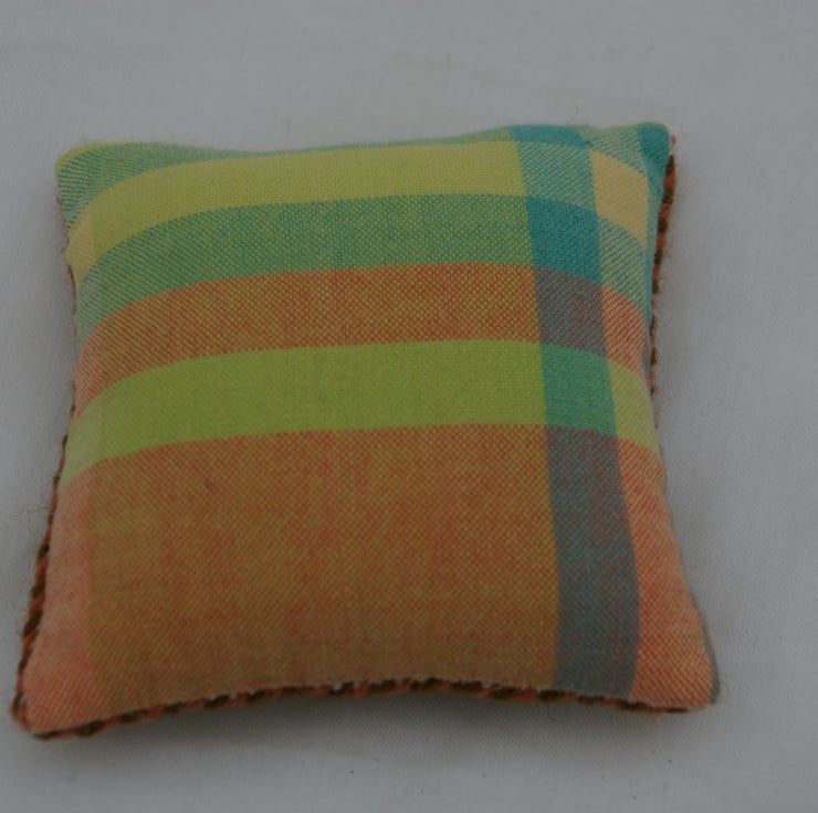 The reserve side of the pin cushion is made from a piece of orange, green and yellow cotton material.
