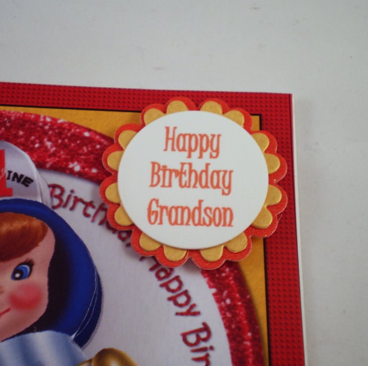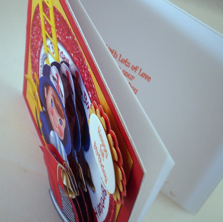 A square card measuring 145x145mm (5.75x5.75in) has a little boy in his fire engine which is 3D/Decoupage. I have used diecut shapes in red and gold for the greeting .This card is for a boys 1st birthday and can be altered for a son, grandson nephew etc. Their name can be added also.