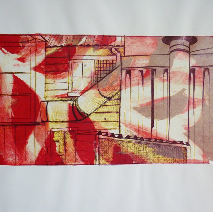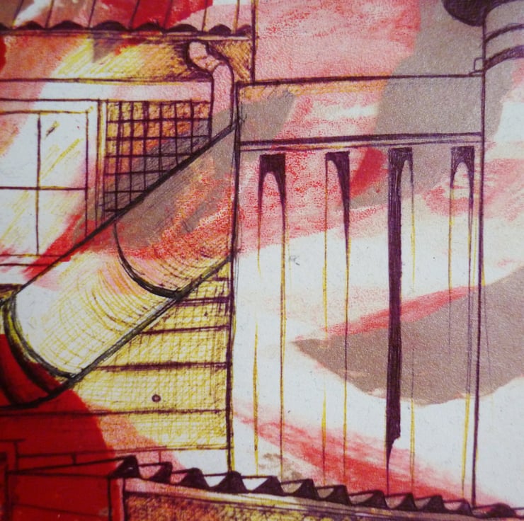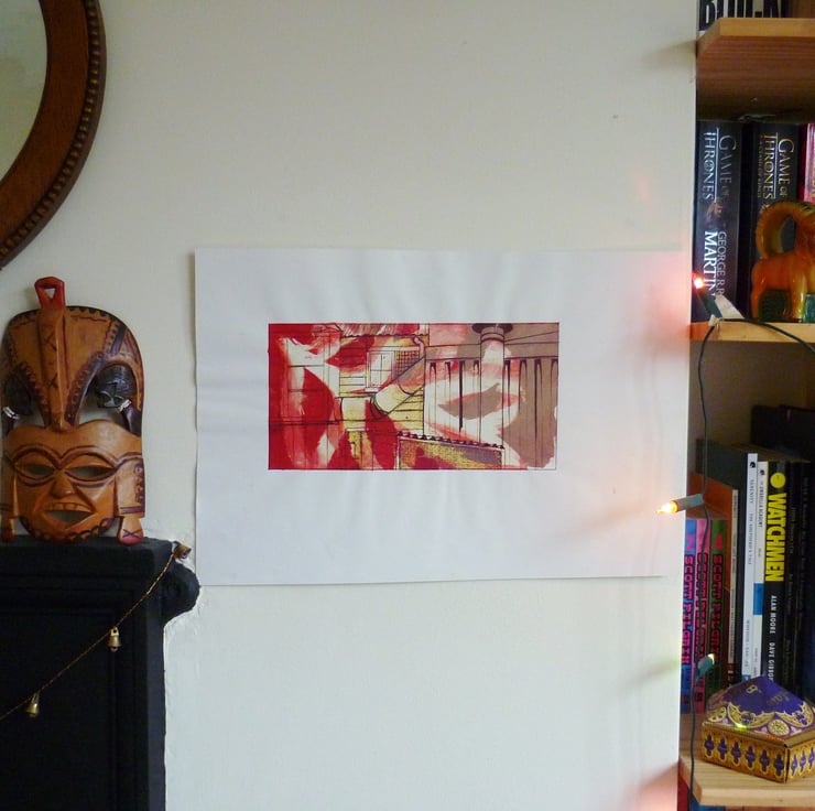 This piece is a screen print with a layer of brio drawings over the top. The print itself is approximately 25cm x 12.5cm but the paper that it is printed on is A3.