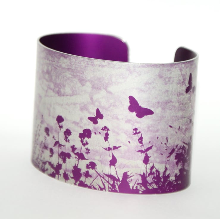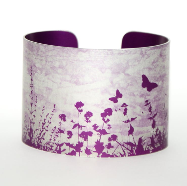 A hand dyed aluminium cuff with a hedgerow along the bottom. The design originates from my own photographs which I layer and edit in Illustrator until I have a black and white image. This is then used as a resist when dyeing the cuff and leaves the design in the silver colour of the metal. Please note your cuff may vary very slightly from the image.
