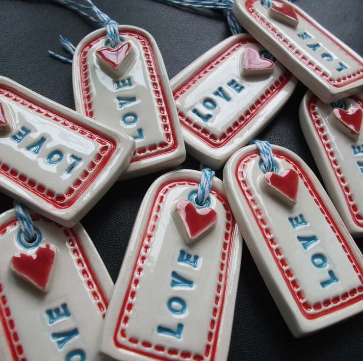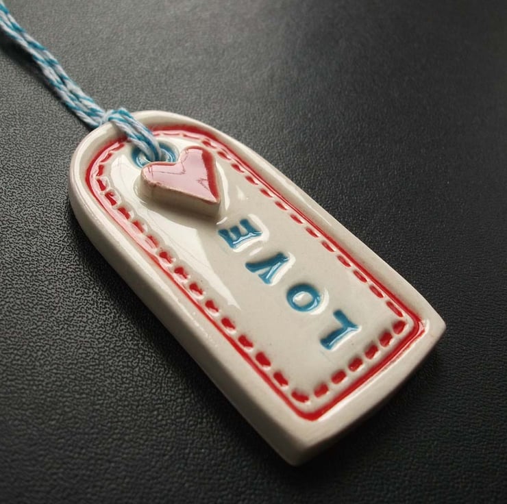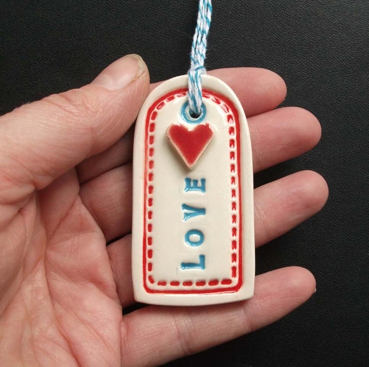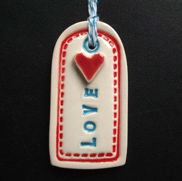 This cute little nautical colour themed tag decoration is made from white earthenware clay and imprinted with the word LOVE.